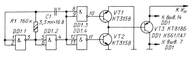 В общем случае, когда плюсовой вывод питания микросхемы подключен непосредственно к источнику постоянного напряжения, работа генератора несколько различна в случаях применения микросхем серий К164, К176 и К561. Длительность выходных импульсов и период колебаний находятся в зависимости не только от произведения номиналов времязадающей цепи (R1C1), но и от числа ограничительных (защитных) диодов во входных цепях элементов микросхем. Так, если в генераторе использованы элементы с одним диодом, время зарядки конденсатора С1 через резистор R1 до порогового напряжения равно 0,7 R1C1, а разрядки - 1,1 R1C1. Период колебаний будет равен t=1,8R1C1 с. Если же в элементах по два диода, значения времени зарядки и разрядки равны, период равен t=1,4R1C1 с.