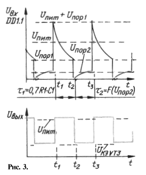 На рис. 3 представлены временные диаграммы, иллюстрирующие работу описываемого коммутатора. Видно, что диаграмма напряжения на левой по схеме обкладке конденсатора С1 (по сравнению с аналогичной диаграммой в [2] на рис. 10, б) имеет характерную особенность: переключение элемента DD1.1 по выходу в состояние 1 происходит при пороговом напряжении Uпор2, значительно меньшем, чем Uпор1. Объясняется это тем, что в течение времени t2=t3 - t2 напряжение питания микросхемы равно падению напряжения на открытом транзисторе VT3 (см. рис 2). А поскольку оно значительно меньше Uпит то и переключение элементов в этот промежуток времени происходит при значительно меньшем пороговом напряжении.