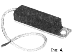 Затем из плотной бумаги склеивают прямоугольную форму, которую отогнутыми краями приклеивают к пластине так, чтобы детали оказались внутри формы. Высота стенок формы должна быть на 1,5...2 мм больше высоты смонтированного узла. К эмиттеру мощного транзистора припаивают гибкий вывод длиной 15...20 см из многожильного провода сечением 1мм2. Вывод пропускают через отверстие, предварительно проткнутое шилом в стенке формы в соответствующем месте. Вторым выводом служит пластина-основание. В форму заливают эпоксидный клей и, слегка наклоняя пластину, дают возможность всплыть пузырькам воздуха. После затвердевания смолы блок обтачивают напильником с трех сторон.