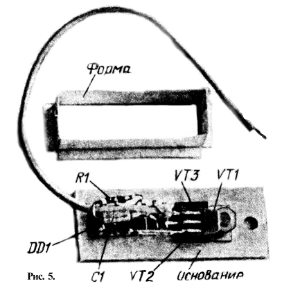 Конструктивно коммутатор выполнен в виде герметичного блока (рис.4). Из листового металла с хорошей теплопроводностью (медь, алюминиевый сплав, латунь) вырезают прямоугольную пластину-основание размерами 50х20х4 мм. Толщину пластины выбирают из соображений обеспечения необходимой жесткости конструкции. К пластине винтом или заклепкой крепят мощный транзистор VT3, после чего к его выводам припаивают остальные детали. Микросхему на пластину кладут выводами вверх (рис. 5).