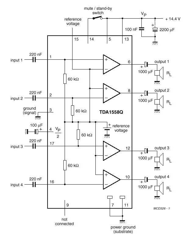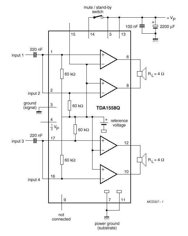 Типовое включение микросхемы TDA1558Q (4х11Вт) |