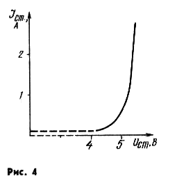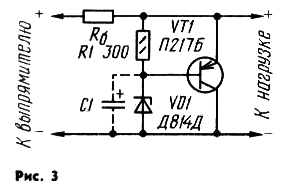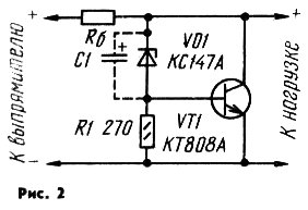 Подобный стабилизатор работоспособен при токах нагрузки, не превышающих максимального тока стабилизации для данного стабилитрона. А если ток нагрузки значительно больше, пользуются более мощным стабилитроном, например, серии Д815, допускающим ток стабилизации 1...1,4 А. При отсутствии такого стабилитрона подойдет маломощный, но использовать его нужно в паре с мощным транзистором, как показано на рис. 2. В итоге получается аналог мощного стабилитрона, обеспечивающий на нагрузке достаточно стабильное напряжение даже при токе 2 А, хотя максимальный ток стабилизации указанного на схеме стабилизатора КС147А составляет 58 мА. Работает аналог так. Пока питающее напряжение, поступающее от выпрямителя, меньше напряжения пробоя стабилитрона, транзистор закрыт, ток через аналог незначительный (прямая горизонтальная ветвь вольт- амперной характеристики аналога, приведенной на рис. 4). При увеличении питающего напряжения стабилитрон пробивается, через него начинает протекать ток и транзистор приоткрывается (изогнутая часть характеристики) Дальнейшее увеличение питающего напряжения приводит к резкому росту тока через стабилитрон и транзистор, а значит, к стабилизации выходного напряжения на определенном значении (вертикальная ветвь характеристики), как и в обычном параметрическом стабилизаторе. Эффект стабилизации достигается благодаря тому, что в режиме пробоя стабилитрон обладает малым дифференциальным сопротивлением и с коллектора транзистора на его базу осуществляется глубокая отрицательная обратная связь. Поэтому при уменьшении выходного напряжения будет уменьшаться ток через стабилитрон и базу транзистора, что приведет к значительно большему (в h21Э раз) уменьшению коллекторного тока, а значит, к увеличению выходного напряжения. При увеличении же выходного напряжения будет наблюдаться обратный процесс. Значение стабилизированного выходного напряжения определяют суммированием напряжения стабилизации стабилитрона с напряжением эмиттерного перехода открытого транзистора (» 0,7 В для кремниевого транзистора и » 0,3 В для германиевого). Максимальный же ток стабилизации аналога будет практически в h21Э раз превышать такой же параметр используемого стабилитрона. Соответственно во столько же раз будет больше и мощность рассеивания на транзисторе по сравнению с мощностью на стабилитроне. Из приведенных соотношений нетрудно сделать вывод, что статический коэффициент передачи мощного транзистора должен быть не менее частного от деления максимального тока потребления нагрузки к максимальному току стабилизации стабилитрона. Максимально допустимый ток коллектора транзистора и напряжение между коллектором и эмиттером должны превышать соответственно заданный ток стабилизации аналога и выходное напряжение. При использовании транзистора структуры р-п-р его следует подключать в соответствии с приведенной на рис. 3 схемой. В этом варианте транзистор можно укрепить непосредственно на шасси питаемой конструкции, а остальные детали аналога смонтировать на выводах транзистора. Для снижения пульсаций выходного напряжения и уменьшения дифференциального сопротивления аналога параллельно выводам стабилитрона можно включить оксидный конденсатор емкостью 100...500 мкФ. В заключение немного о температурном коэффициенте напряж