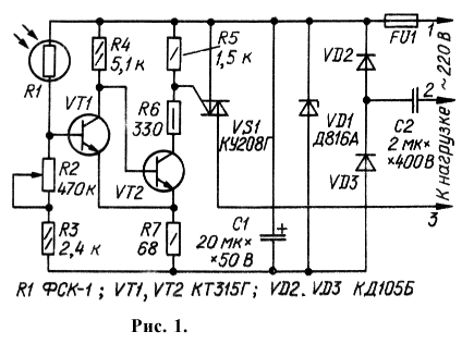 Фотореле (рис.1) состоит из датчика освещенности (R1), порогового устройства, выполненного по схеме триггера Шмитта (VT1, VT2), и коммутирующего элемента (VS1). Фоторезистор R1 вместе с резисторами R2 и R3 образуют делитель напряжения, который определяет ток базы транзистора VT1. В дневное время суток, когда фоторезистор освещен, его сопротивление сравнительно невелико, поэтому транзистор VT1 открыт и насыщен, а VT2 закрыт. Коллекторный ток транзистора VT2, а следовательно, и ток управляющего электрода симистора практически равны нулю. Симистор, таким образом, закрыт, и ток через нагрузку не протекает.
