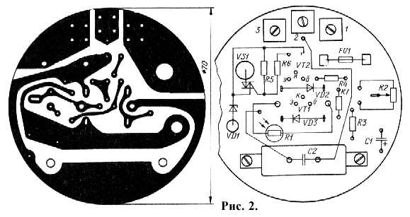 Устройство собрано в круглой пластмассовой разветвительной коробке, предназначенной для наружной проводки. Все элементы смонтированы на круглой печатной плате из одностороннего фольгированного стеклотекстолита толщиной 1,5 мм. Чертеж платы и расположение деталей на ней изображены на рис. 2. Резистор R5 распаян непосредственно на выводах симистора, а резистор R6 — между выводом управляющего электрода и платой. Катоды стабилитрона VD1 и симистора соединены между собой и с платой навесным проводником. Резьбовые выводы анода этих деталей необходимо укоротить так, чтобы они не выступали за пределы крепежных гаек. Фоторезистор своими выводами вставляют во впаянные в плату трубчатые стойки высотой 25 мм так, что под ним освобождается место для монтажа других деталей. В качестве стоек использованы гнезда соответствующего диаметра от штыревого разъема.
