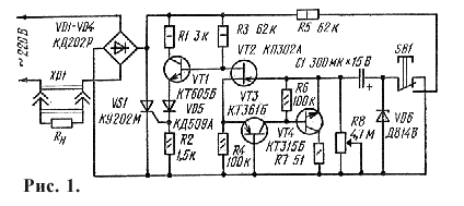 Схема реле времени показана на рис. 1. Оно содержит выпрямительный мост на диодах VD1 - VD4, тринистор VS1, электронный ключ VT1 и времязадающий узел на транзисторах VT2 - VT4. В исходном состоянии, пока кнопка SB1 не нажата, конденсатор С1 разряжен, транзисторы VT2 - VT4 открыты, транзистор VT1 и тринистор VS1 закрыты. В это время через нагрузочное устройство Rн, подключенное к разъему ХР1, ток не протекает. При нажатии на кнопку SB1 через резистор R5 и р-п переходы транзисторов VT2, VT3 заряжается конденсатор С1 до напряжения стабилизации стабилитрона VD6. При этом транзисторы VT1 - VT4 и тринистор VS1 находятся в исходном состоянии. После отпускания кнопки вывод положительной обкладки конденсатора вновь соединяется с общим проводом реле времени и на затворе полевого транзистора VT2 возникает отрицательное напряжение. Транзистор VT2 при этом закрывается и закрывает транзисторы VT3 и VT4. Одновременно током, протекающим через резистор R3, открывается транзистор VT1, который коллекторным током открывает тринистор VS1. При открытом транзисторе VT1 тринистор открывается в начале каждого полупериода сетевого напряжения, пропуская номинальный ток через подключенное устройство. После разрядки конденсатора С1 (через резистор R8) до напряжения 5В, соответствующего напряжению отсечки транзистора VT2, этот транзистор приоткрывается, что приводит к открыванию транзисторов VT3 и VT4, образующих для транзистора VT2 положительную обратную связь. Теперь конденсатор С1 быстро разряжается через малое сопротивление открытого транзистора VT4 и резистор R7, в результате транзистор VT2 полностью открывается. При этом транзистор VT1 и тринистор закрываются, а нагрузочное устройство Rн обесточивается - реле времени устанавливается в исходное состояние.