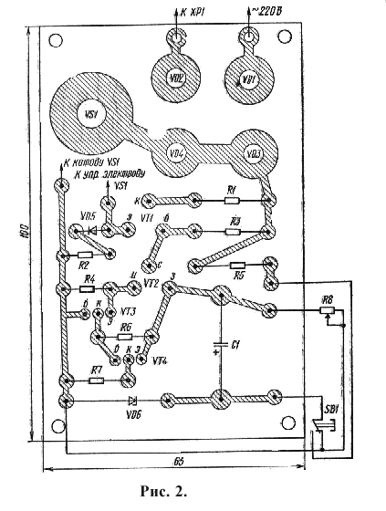 Диод VD5 улучшает режим закрывания транзистора VT1 и, кроме того, позволяет использовать полевой транзистор VT2 с меньшим током стока, например КП307.