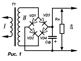 Поскольку в преобладающем большинстве конструкций блоков питания используется двухполупериодный выпрямитель, диоды которого включены по мостовой схеме (рис. 1), о выборе его элементов здесь и пойдет разговор. Рассчитать выпрямитель - значит правильно выбрать выпрямительные диоды и конденсатор фильтра, а также определить необходимое переменное напряжение, снимаемое для выпрямления с вторичной обмотки сетевого трансформатора. Исходными данными для расчета выпрямителя служат: требуемое напряжение на нагрузке (Uн) и потребляемый ею максимальный ток (Iн).