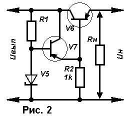 Может случиться, что маломощный стабилитрон не подойдет по максимальному току стабилизации и придется выбирать стабилитрон значительно большей мощности - такое случается при больших токах потребления и использовании транзистора с малым коэффициентом h21Э. В таком случае целесообразно ввести в стабилизатор дополнительный транзистор V7 малой мощности (рис. 2), который позволит снизить максимальный ток нагрузки для стабилитрона (а значит, и ток стабилизации) примерно в h21Э раз и применить, соответственно, маломощный стабилитрон.