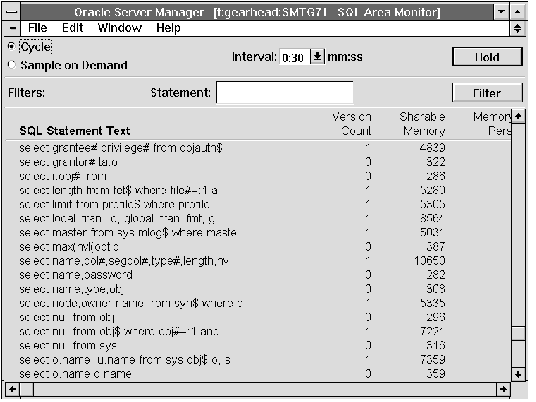 The following figure illustrates the left-most columns of the SQL Area Monitor.