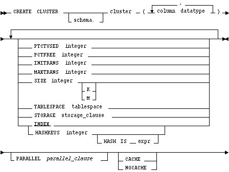 CREATE CLUSTER personnel ( department_number NUMBER(2) ) SIZE 512 STORAGE (INITIAL 100K NEXT 50K PCTINCREASE 10)