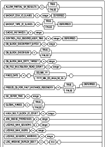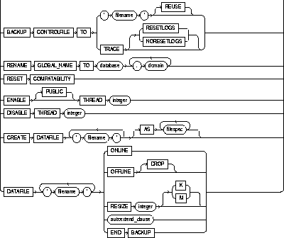 identifies the database to be altered. The database name can contain only ASCII characters. If you omit database, Oracle alters the database identified by the value of the initialization parameter DB_NAME. You can alter only the database whose control files are specified by the initialization parameter CONTROL_FILES. Note that the database identifier is not related to the Net8 database specification. |