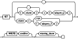 If the SET clause contains a subquery, it must return exactly one row for each row updated. Each value in the subquery result is assigned respectively to the columns in the parenthesized list. If the subquery returns no rows, then the column is assigned a null. Subqueries may select from the table being updated. The SET clause may mix assignments of expressions and subqueries. |