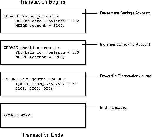 Oracle must allow for two situations. If all three SQL statements can be performed to maintain the accounts in proper balance, the effects of the transaction can be applied to the database. However, if something (such as insufficient funds, invalid account number, or a hardware failure) prevents one or two of the statements in the transaction from completing, the entire transaction must be rolled back so that the balance of all accounts is correct.