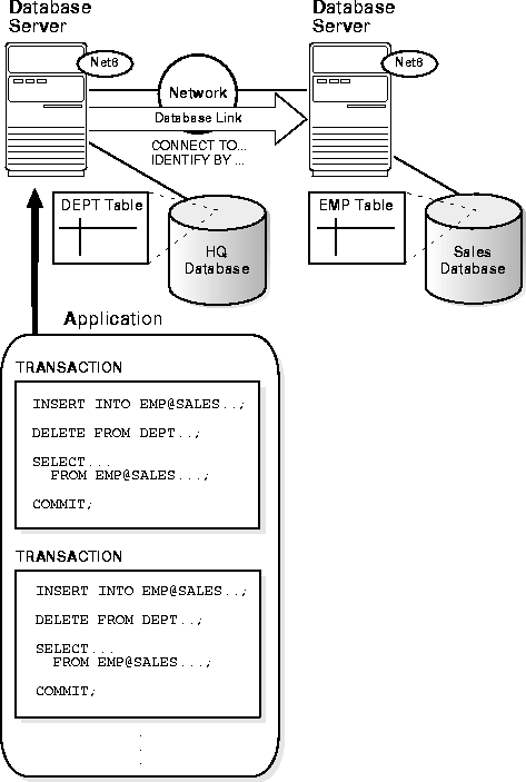 A database server is the Oracle software managing a database, and a client is an application that requests information from a server. Each computer in a system is a node. A node in a distributed database system act as a client, a server, or both, depending on the situation. For example, in Figure 30-1, the computer that manages the HQ database is acting as a database server when a statement is issued against its local data (for example, the second statement in each transaction issues a query against the local DEPT table), and is acting as a client when it issues a statement against remote data (for example, the first statement in each transaction is issued against the remote table EMP in the SALES database).