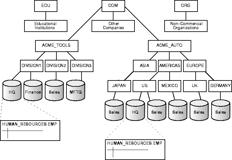For example, the network domains US.AMERICAS.ACME_AUTO.COM and UK.EUROPE.ACME_AUTO.COM in Figure 30-2 each contain a SALES database: