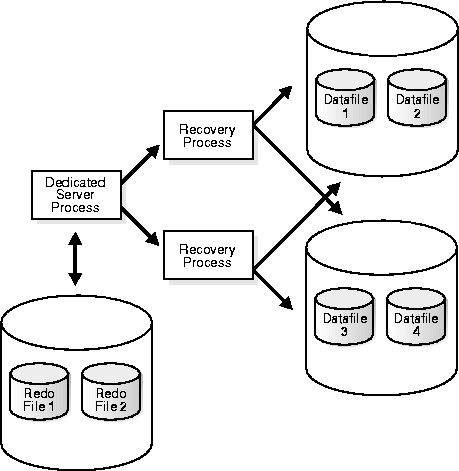 In a typical parallel recovery situation, one process is responsible for reading and dispatching redo entries from the redo log files. This is the dedicated server process that begins the recovery session. The server process reading the redo log files enlists two or more recovery processes to apply the changes from the redo entries to the datafiles.