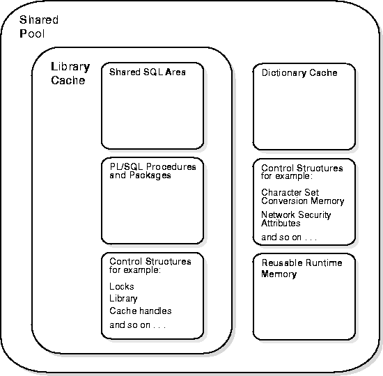 The shared pool portion of the SGA contains three major areas: library cache, dictionary cache, and control structures. Figure 6-1 shows the contents of the shared pool.