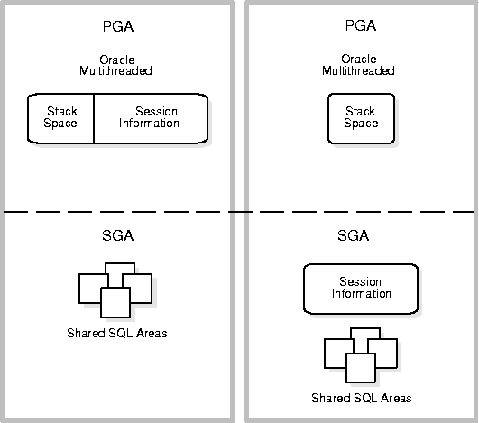 If the instance is running without the multithreaded server, the PGA also contains information about the user's session, such as private SQL areas. If the instance is running in multithreaded server configuration, this session information is not in the PGA, but is instead allocated in the SGA.