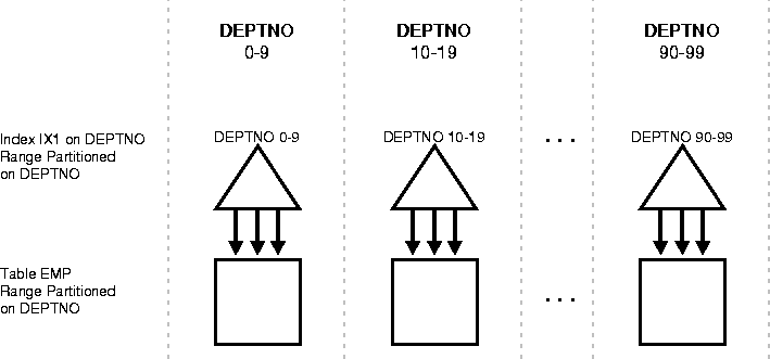 For example, in Figure 9-4 ("Local Prefixed Index" on page 9-24) if the predicate is DEPTNO=15, the optimizer knows to apply the predicate only to the second partition of the index. (If the predicate involves a bind variable, the optimizer will not know exactly which partition but it may still know there is only one partition involved, in which case at run time only one index partition will be accessed.)