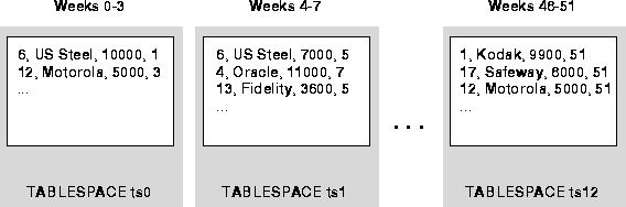 CREATE TABLE sales ( acct_no NUMBER(5), acct_name CHAR(30), amount_of_sale NUMBER(6), week_no INTEGER ) PARTITION BY RANGE ( week_no ) ... (PARTITION sales1 VALUES LESS THAN ( 4 ) TABLESPACE ts0, PARTITION sales2 VALUES LESS THAN ( 8 ) TABLESPACE ts1, ... PARTITION sales13 VALUES LESS THAN ( 52 ) TABLESPACE ts12 );
