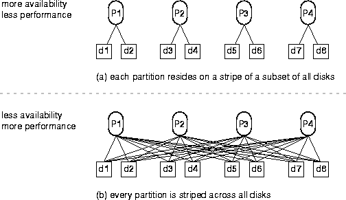 Intermediate configurations are also possible, where subsets of partitions are striped over subsets of disks.