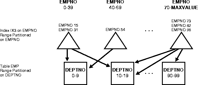 For example, a query using the predicate "ACCTNO between 40 and 45" on the table CHECKS of Figure 9-5 ("Local Non-Prefixed Index" on page 9-25) causes parallel scans of all the partitions of the non-prefixed index IX3. On the other hand, a query using the predicate "DEPTNO between 40 and 45" on the table DEPTNO of Figure 9-4 ("Local Prefixed Index" on page 9-24) cannot be parallelized because it accesses a single partition of the prefixed index IX1.