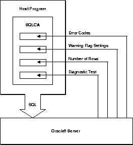 The SQLCA is a data structure that provides for diagnostic checking and event handling. At run time, the SQLCA holds status information passed to your program by Oracle8. After executing a SQL statement, Oracle8 sets SQLCA variables to indicate the outcome, as illustrated in Figure 2-2.