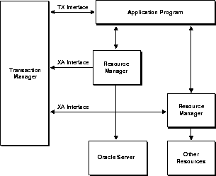 X/Open applications run in a distributed transaction processing (DTP) environment. In an abstract model, an X/Open application calls on resource managers (RMs) to provide a variety of services. For example, a database resource manager provides access to data in a database. Resource managers interact with a transaction manager (TM), which controls all transactions for the application.