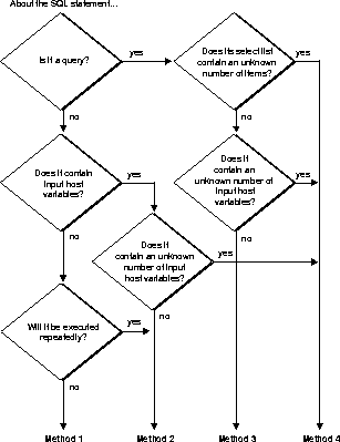 Method 4 provides maximum flexibility, but requires complex coding and a full understanding of dynamic SQL concepts. In general, use Method 4 only if you cannot use Methods 1, 2, or 3. The decision logic in Figure 11-1 will help you choose the correct method.