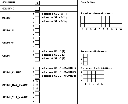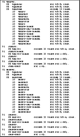 WORKING-STORAGE SECTION. ... 01 SELDSC. 05 SQLDNUM PIC S9(9) COMP. 05 SQLDFND PIC S9(9) COMP. 05 SELDVAR OCCURS 3 TIMES. 10 SELDV PIC S9(9) COMP. 10 SELDFMT PIC S9(9) COMP. 10 SELDVLN PIC S9(9) COMP. 10 SELDFMTL PIC S9(4) COMP. 10 SELDVTYP PIC S9(4) COMP. 10 SELDI PIC S9(9) COMP. 10 SELDH-VNAME PIC S9(9) COMP. 10 SELDH-MAX-VNAMEL PIC S9(4) COMP. 10 SELDH-CUR-VNAMEL PIC S9(4) COMP. 10 SELDI-VNAME PIC S9(9) COMP. 10 SELDI-MAX-VNAMEL PIC S9(4) COMP. 10 SELDI-CUR-VNAMEL PIC S9(4) COMP. 10 SELDFCLP PIC S9(9) COMP. 10 SELDFCRCP PIC S9(9) COMP. 01 XSELDI. 05 SEL-DI OCCURS 3 TIMES PIC S9(9) COMP. 01 XSELDIVNAME. 05 SEL-DI-VNAME OCCURS 3 TIMES PIC X(5). 01 XSELDV. 05 SEL-DV OCCURS 3 TIMES PIC X(10). 01 XSELDHVNAME. 05 SEL-DH-VNAME OCCURS 3 TIMES PIC X(5).