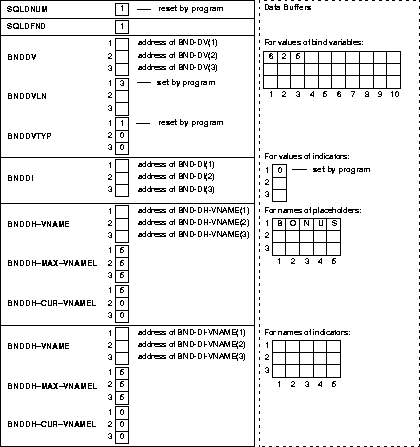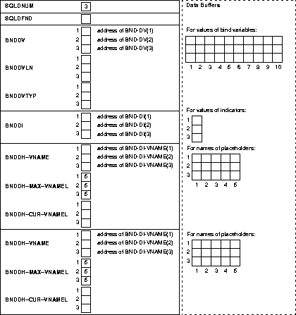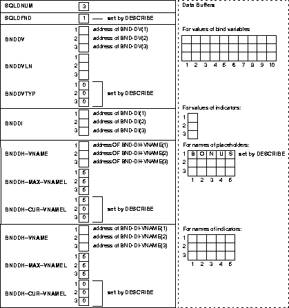 Figure 12-5 shows the bind descriptor in our example after the DESCRIBE. Notice that DESCRIBE has set SQLDFND to the actual number of place-holders found in the processed SQL statement.