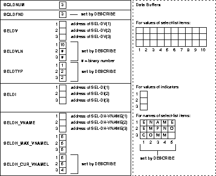 Figure 12-7 shows the select descriptor in our example after the DESCRIBE. Notice that DESCRIBE has set SQLDFND to the actual number of items found in the query select list. If the SQL statement is not a query, SQLDFND is set to zero.