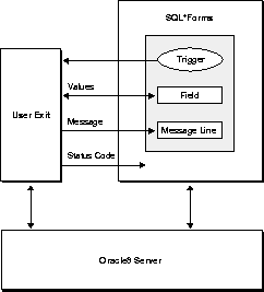 When called by a SQL*Forms trigger, the user exit runs, then returns a status code to SQL*Forms (refer to Figure 13-1). Your user exit can display messages on the SQL*Forms status line, get and put field values, manipulate Oracle8 data, do high-speed computations and table lookups-even log on to different databases.
