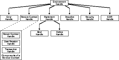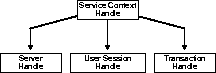 The service context contains three additional handles that represent a server connection, a user session, and a transaction, as illustrated in the following figure.