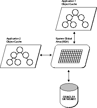 Note: Oracle8 does not support automatic cache coherency with the server's buffer cache or database. Automatic cache coherency refers to the mechanism by which the object cache refreshes local object copies when the corresponding objects have been modified in the server's buffer cache, and the object cache flushes the changes made to local object copies to the buffer cache before any direct access of corresponding objects in the server. Direct access includes using SQL, triggers, or stored procedures to read or modify objects in the server.