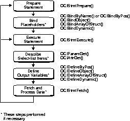 For each of the steps in the diagram, the corresponding OCI function calls are listed. In some cases multiple calls may be required.