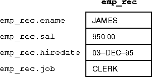the value in the ename column of the emp table is assigned to the ename field of emp_rec, the value in the sal column is assigned to the sal field, and so on. Figure 1-3 shows how the result might appear.