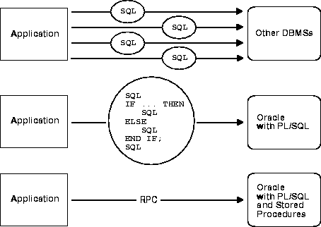 However, with PL/SQL, an entire block of statements can be sent to Oracle at one time. This can drastically reduce communication between your application and Oracle. As Figure 1-5 shows, if your application is database intensive, you can use PL/SQL blocks and subprograms to group SQL statements before sending them to Oracle for execution.