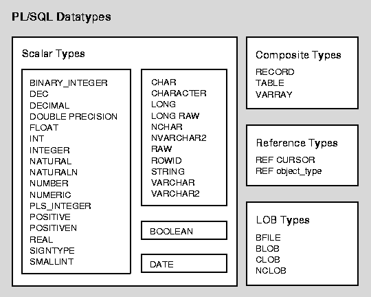 Every constant and variable has a datatype, which specifies a storage format, constraints, and valid range of values. PL/SQL provides a variety of predefined datatypes. A scalar type has no internal components. A composite type has internal components that can be manipulated individually. A reference type holds values, called pointers, that designate other program items. A LOB type holds values, called locators, that specify the location of large objects (graphic images for example) stored out-of-line.