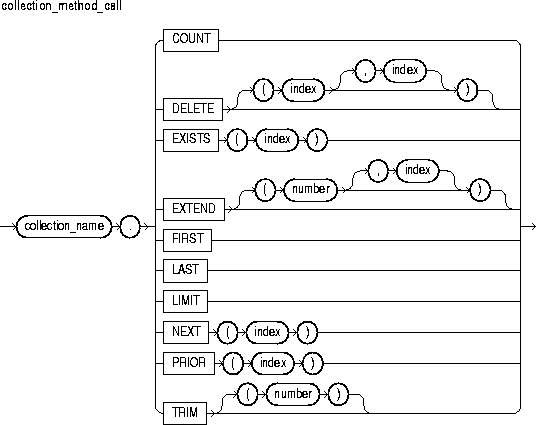 EXISTS, COUNT, LIMIT, FIRST, LAST, PRIOR, and NEXT are functions, which appear as part of an expression. EXTEND, TRIM, and DELETE are procedures, which appear as a statement. EXISTS, PRIOR, NEXT, TRIM, EXTEND, and DELETE take integer parameters. For more information, see "Using Collection Methods".