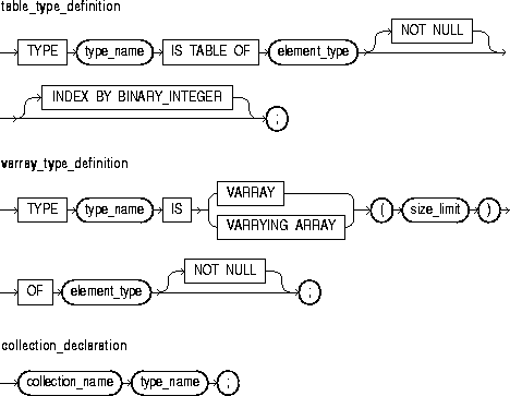 This identifies a nested table, index-by table, or varray previously declared within the current scope. For the syntax of collection_declaration, see "Collections".