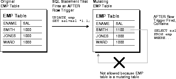 Notice that the SQL statement is executed for the first row of the table and then an AFTER ROW trigger is fired. In turn, a statement in the AFTER ROW trigger body attempts to query the original table. However, because the EMP table is mutating, this query is not allowed by Oracle. If attempted, a runtime error occurs, the effects of the trigger body and triggering statement are rolled back, and control is returned to the user or application.