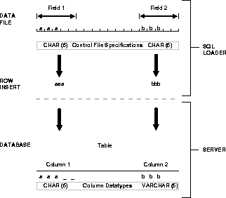 In Figure 3-5, two CHAR fields are defined for a data record. The field specifications are contained in the control file. Note that the control file CHAR specification is not the same as the database CHAR specification. A data field defined as CHAR in the control file merely tells SQL*Loader how to create the row insert. The data could then be inserted into a CHAR, VARCHAR2, NCHAR, NVARCHAR, or even a NUMBER column in the database, with the Oracle8 Server handling any necessary conversions.