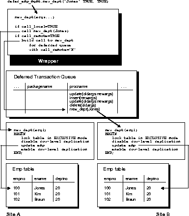 The wrapper package has the same name as the original package, but its name is prefixed with the string you supply when you generate replication support for the procedure. If you do not supply a prefix, Oracle uses the default prefix, "defer_". The wrapper procedure has the same parameters as the original, along with two additional parameters: CALL_LOCAL and CALL_REMOTE. These two boolean parameters determine where the procedure gets executed. When CALL_LOCAL is TRUE, the procedure is executed locally. When CALL_REMOTE is TRUE, the procedure will ultimately be executed at all other master sites in the replicated environment.