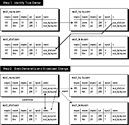 For example, Figure 7-6 illustrates how ownership of employee 100 passes from the ACCT_SF database to the ACCT_NY database.