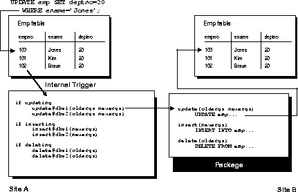 The necessary remote procedure calls to support synchronous replication are included in the internal trigger for each object. When you generate replication support for a replicated object, Oracle activates the triggers at all master sites to add the necessary remote procedure calls for the new site. Conversely, when you remove a master site from a master group, Oracle removes the calls from the internal triggers.