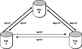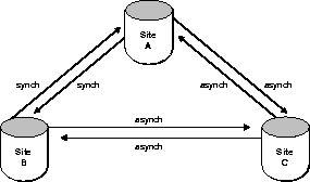 As another example, consider what would happen if you created site A as the master definition site, then added site C with an asynchronous propagation mode, then added site B with a synchronous propagation mode? Now the propagation modes would be as shown in Figure 7-4.