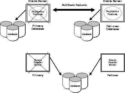 Oracle's advanced replication facility can be used to provide survivability against site failures by using multiple replicated master sites. You must configure your system using one of the following methods. These methods are listed in order of increasing implementation difficulty.