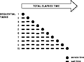 In this example only task 1 runs without having to wait. Task 2 must wait until task 1 has completed; task 3 must wait until tasks 1 and 2 have completed, and so on. (Although the figure shows the independent tasks as the same size, the size of the tasks will vary.)