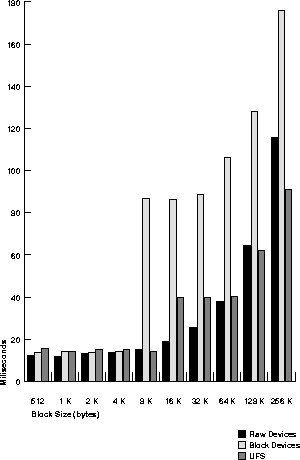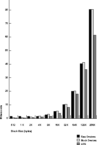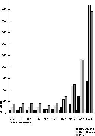 This section illustrates relative performance of read/write operations by a particular test system. On raw devices, reads and writes are done on the character level; on block devices, these operations are done on the block level. (Note also that many concurrent processes may generate overhead due to head and arm movement of the disk drives.)